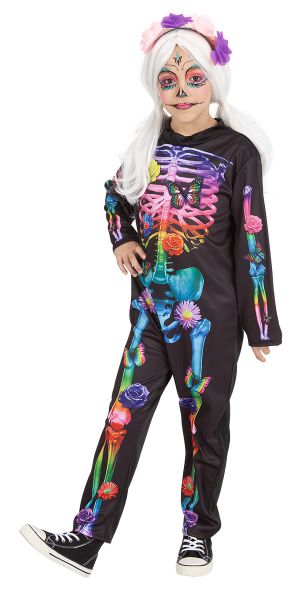 Composizione: Abito a maniche lunghe con stampa digitale e motivi a teschi e scheletri. Collo alto e polsini con decorazioni floreali. Chiusura posteriore in velcro. **Parrucca non inclusa.